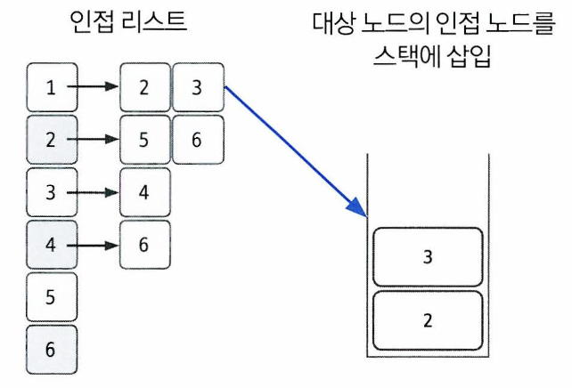 2) 스택에서 노드를 꺼낸 후, 꺼낸 노드의 인접 노드를 다시 스택에 삽입